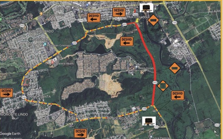 Se realizará el cierre de la PR-693 en la intersección con la PR 695 y se desviará el tránsito en ambas direcciones por la PR-695 hasta la intersección con la PR-696, permitiendo el paso solo al tránsito local para los residentes de la urbanización Sabanera hasta su entrada.