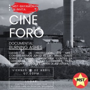 En el foro, se estará exhibiendo el documental “Burning Ashes” un documental sobre de la Carbonera AES de Guayama y el daño ambiental y a la salud de las personas que residen en el área. Luego de la presentación, habrá una conversación sobre la lucha comunitaria contra la carbonera y qué lecciones se pueden aplicar en Bayamón para luchar contra la asfaltera.