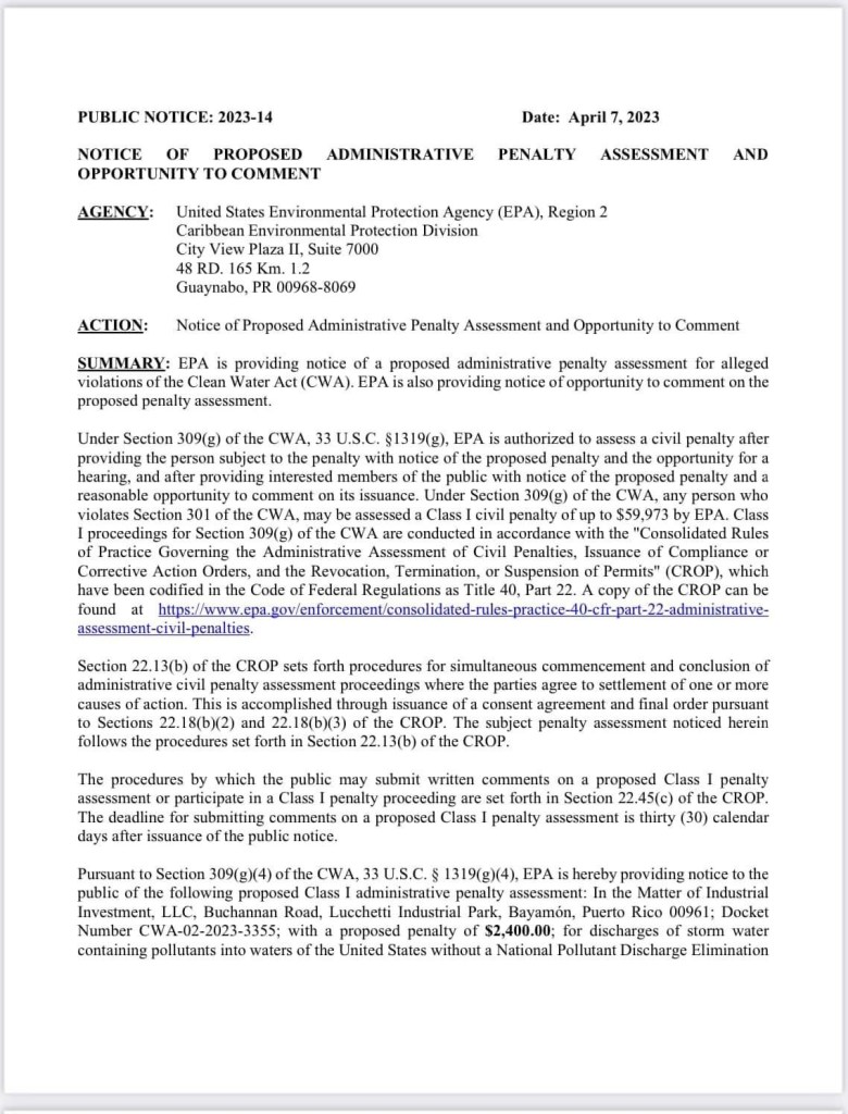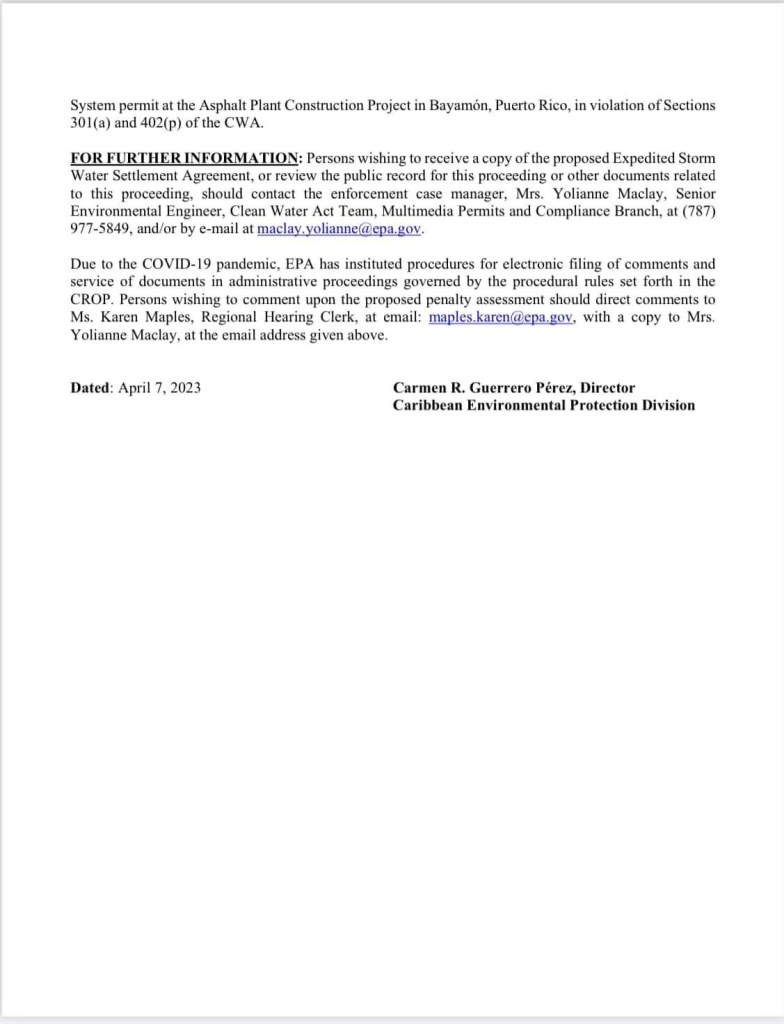 “La EPA emitió un Aviso Público con fecha del 7 de abril, con número de expediente CWA-02-2023-3355, en el cual explica que la asfaltera está en violación de la ley que protege los cuerpos de agua. El documento hace mención de los estatutos violados del «Clean Water Act» y explica que la agencia federal determinó que DB Asphalt descarga contaminantes en los cuerpos de agua cercanos. En el documento público, la EPA también establece que la asfaltera tampoco cuenta con un permiso para la eliminación de descargas de estos contaminantes en la zona.”