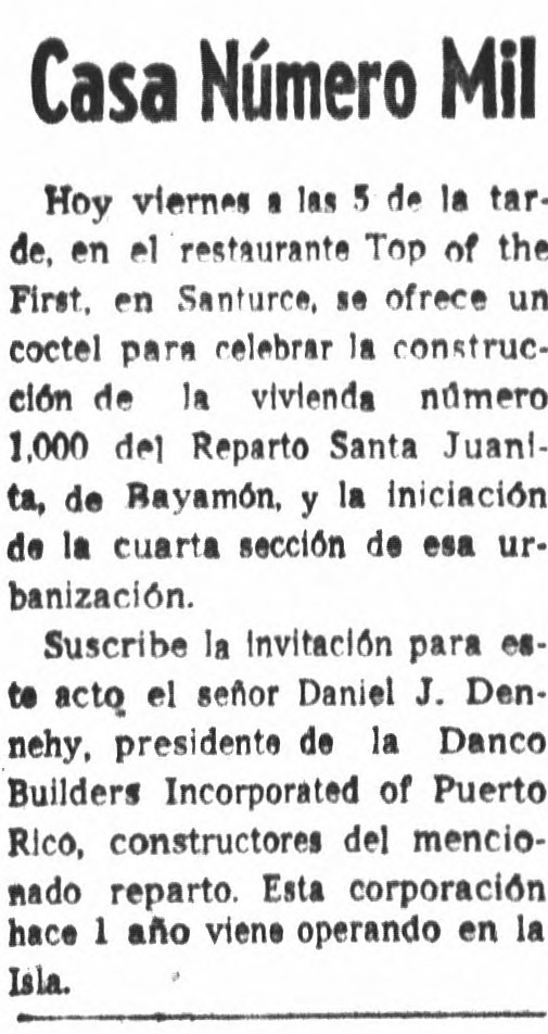 El viernes 9 de junio de 1961, Danco Builders estaba celebrando la construcción de la casa #1,000 y el inicio de la cuarta sección de Santa Juanita. La celebración tuvo lugar en el restaurante Top of the First en Santurce.