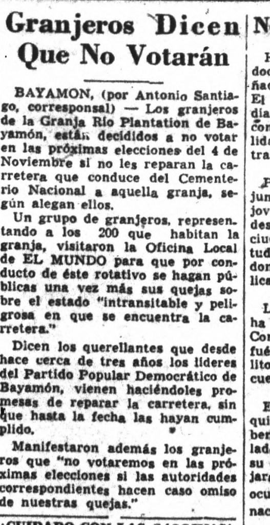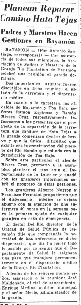“En cuanto a la carretera, los alcaldes de Bayamón y Toa Baja, señores Ramón Espinosa y Ramón Rivera Cruz, respectivamente informaron a los presentes que el proyecto de la reparación de la carretera que conduce de Hato Tejas a la granja comenzará dentro de breve. La única dificultad que existía era la construcción del puente del Río Hondo que colinda con la jurisdicción de Toa Baja. Sobre este particular, el alcalde Rivera Cruz, prometió a la asamblea plantear el caso ante el Departamento de lo Interior y quedó con los granjeros informarles sobré el progreso de estas gestiones. Los granjeros Alberto Negrón y Francisco Fermaint propusieron que el dispensario médico se dejara abierto con la atención de una enfermera 40 horas en la semana para la primera ayuda de cualquier granjero en caso de emergencia. El doctor Del Río, Director de la Unidad de Salud Pública de Bayamón, dijo que comprendía la necesidad de una enfermera en dicho dispensario.”