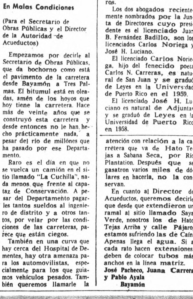 Una carta del lector quejándose de las condiciones de las carreteras en Bayamon. Sin embargo, no se le dice “finca”
