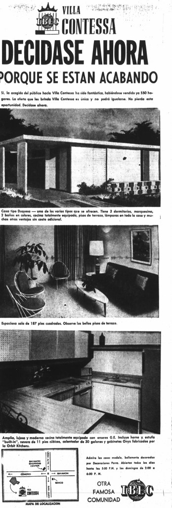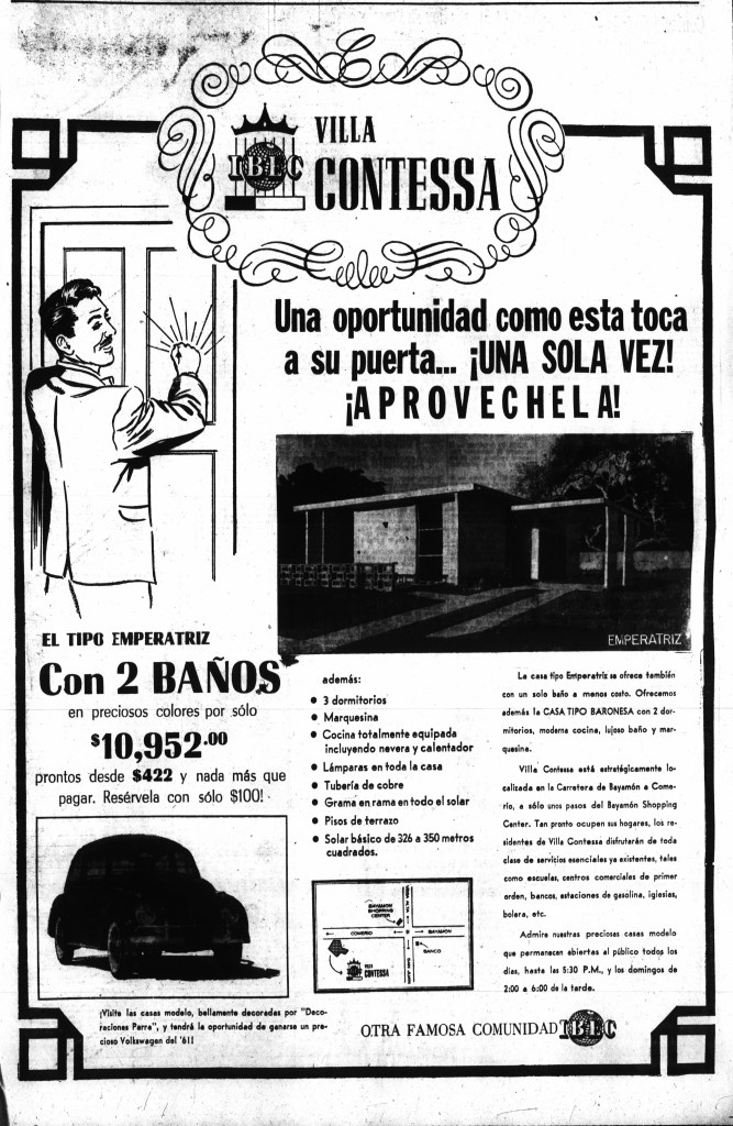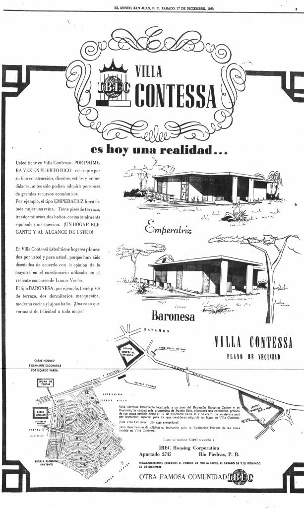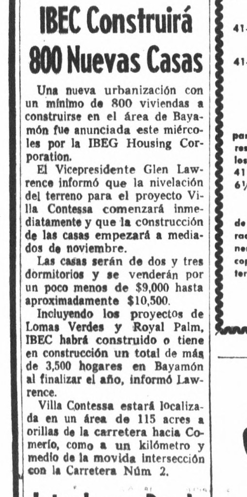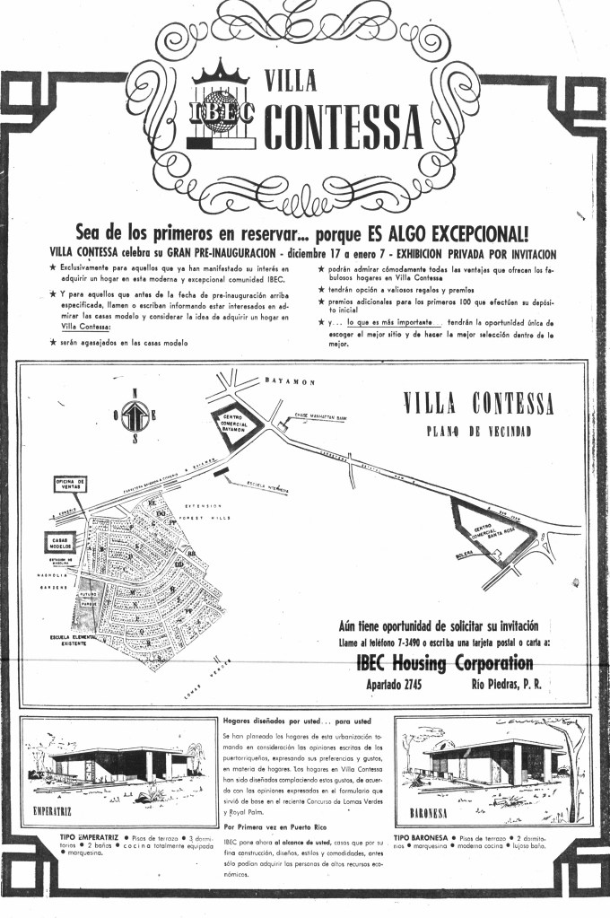 Por favor, escriban sobre Villa Contessa! Creo que la gente comenzó a vivir las casas en el 1961. Mis padres, mi hermana y yo nos mudamos en 1962. Mi mamá y yo seguimos viviendo en Villa Contessa! De aqui no me voy… Por cierto, fuimos caminando hasta la inaguración de Rexville para ver a Lissette y Chucho. 😁”
