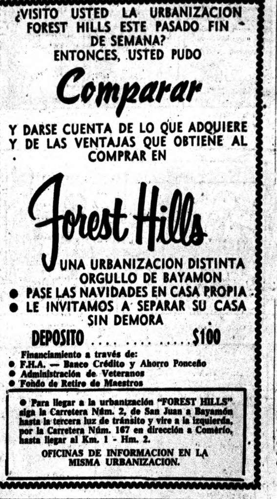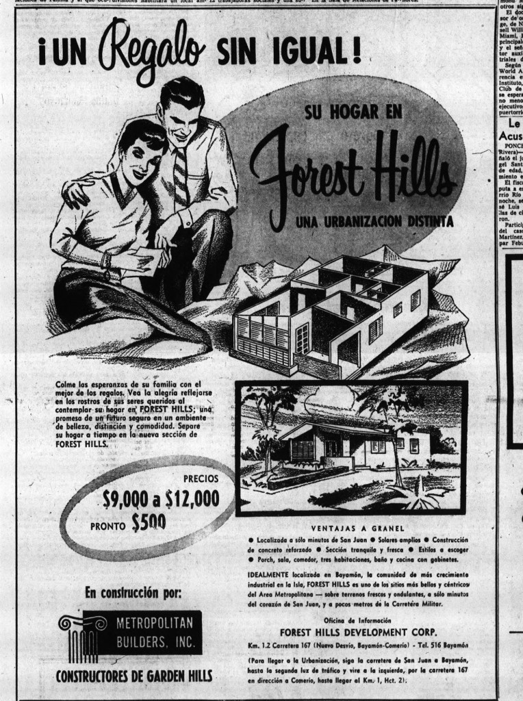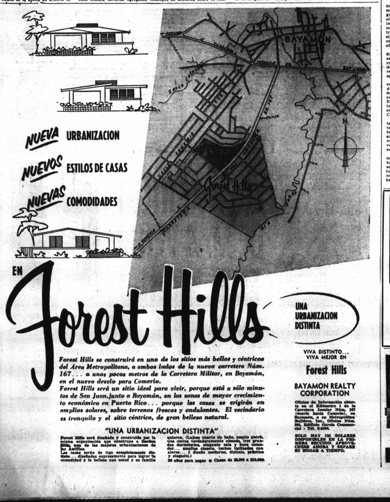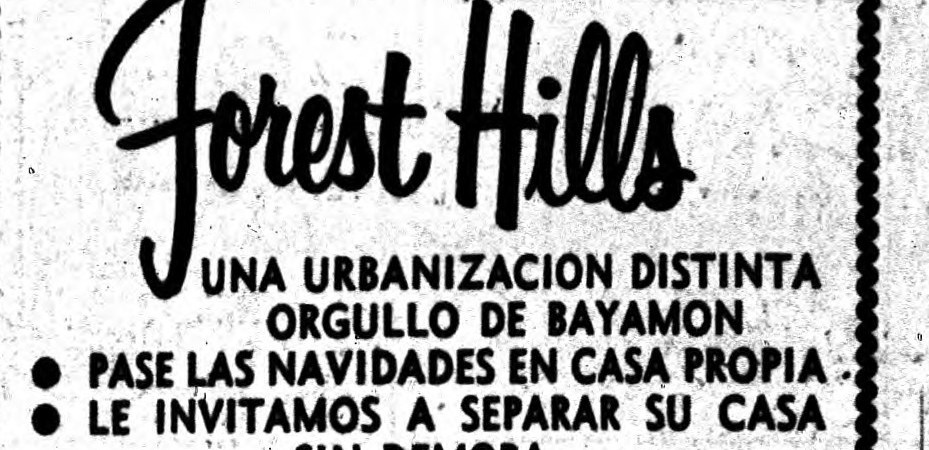 El 22 de abril de 1954, la Bayamón Realty Corporation publicó un anuncio en el periódico El Mundo promocionando a “Forest Hills” como «un sitio ideal para vivir», destacando su ubicación estratégica a solo minutos de San Juan y en la zona de mayor crecimiento económico de Puerto Rico.