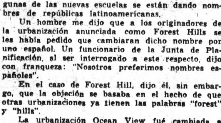Ese mismo año, un artículo del periódico “El “Mundo trajo el tema de que hubo quejas por el nombre de la urbanización, , ya que proliferaban las calles y urbanizaciones con nombres como «Forest» y «Hill». A preguntas del periódico, la Junta de Planificación de Puerto Rico dijo que prefería los nombres en español, Sin embargo, el nombre original se mantuvo.