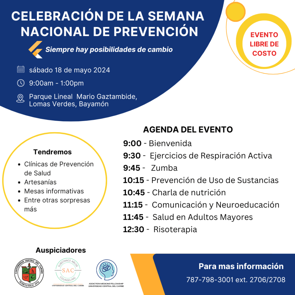La comunidad de Bayamón y pueblos limítrofes está invitada a celebrar la Semana Nacional de Prevención en un evento gratuito que se llevará a cabo el sábado 18 de mayo de 2024, de 9:00 a.m. a 1:00 p.m., en el Parque Lineal Mario Gaztambide, ubicado en Lomas Verdes.