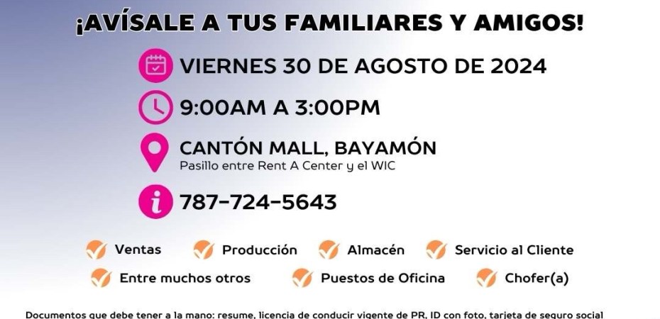 Se recomienda a los participantes llevar su resumé, evidencia de estudios, certificado de conducta, tarjeta de seguro social o certificado de nacimiento, y una identificación con foto vigente.