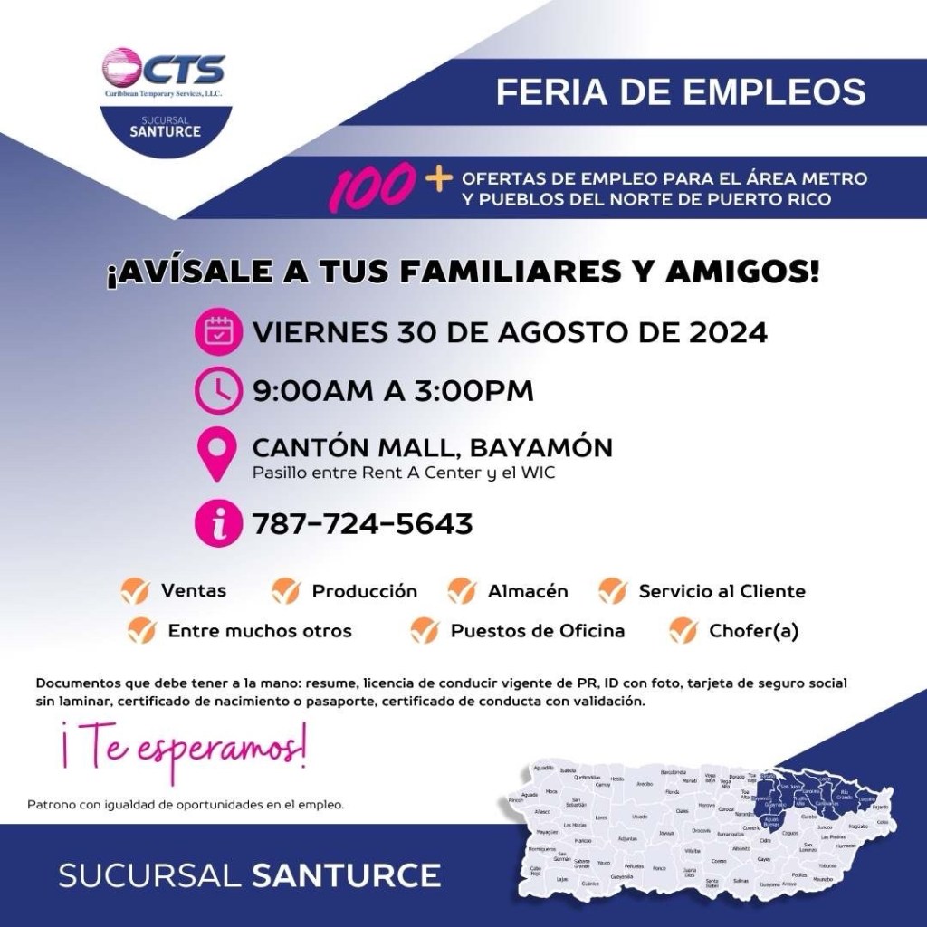 Caribbean Temporary Services, LLC (CTS) ha anunciado una feria de empleo con más de 100 puestos disponibles en la zona metropolitana y área norte de Puerto Rico. El evento se llevará a cabo el viernes, 30 de agosto, de 9:00 a.m. a 3:00 p.m. en el Centro Comercial Cantón Mall en Bayamón.