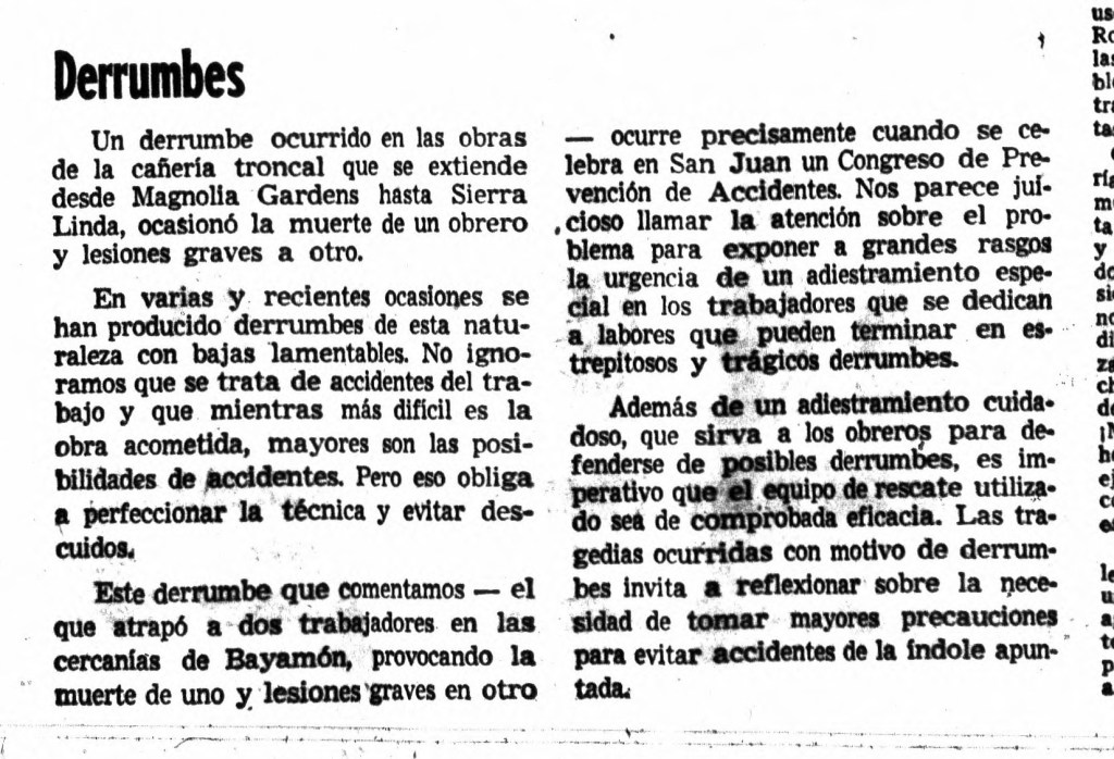 El desarrollo de Sierra Linda y otras urbanizaciones cercanas conllevó la instalación de nuevas tuberías principales. Como resultado, ocurrieron múltiples derrumbes debido a la topografía montañosa del área. En una carta publicada en la sección “Voces del lector” del El Mundo se documenta un incidente: “Un derrumbe ocurrido en las obras de la cañería troncal que se extiende desde Magnolia Gardens hasta Sierra Linda ocasionó la muerte de un obrero y lesiones graves a otro. En varias y recientes ocasiones se han producido derrumbes de esta naturaleza con bajas lamentables”.