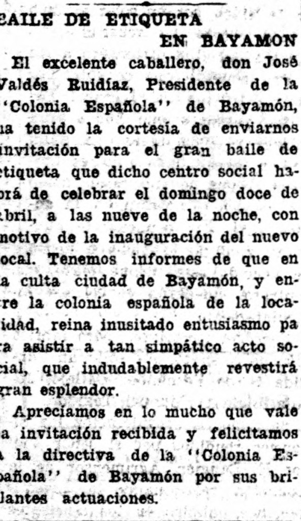 «El excelente caballero, don José Valdés Ruidíaz, Presidente de la «Colonia Española» de Bayamón, ha tenido la cortesía de enviarnos invitación para el gran baile de etiqueta que dicho centro social habrá de celebrar el domingo doce de abril, a las nueve de la noche, con motivo de la inauguración del nuevo local.»