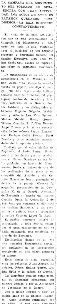 «Invitado por el culto Alcalde de Bayamón, el Lcdo. Pons—Parés asistí a las fiestas que se celebraron el último domingo en esa bella población en honor del Monumento. Desde el balcón de una de las residencias de la plaza y en compañía del Alcalde y del Comité Ejecutivo local, presencié el desfile de la parada. Observé la magnífica preparación de la Compañía K. de la Guardia Nacional de Bayamón al mando del bizarro Capitán Ortiz, la Compañía de San Juan que comanda el distinguido capitán Santaella, y las fuerzas de la policía, bajo el simpático y activo Capitán López de Azúa. El pueblo numeroso asistió expectante y todo dejaba entender el gran entusiasmo de que se halla embargada esta patriótica población de Bayamón. Distinguidas damas de la más alta sociedad Bayamonesa colocaron insignias en los automóviles, recogiendo así una buena cantidad de dinero. «