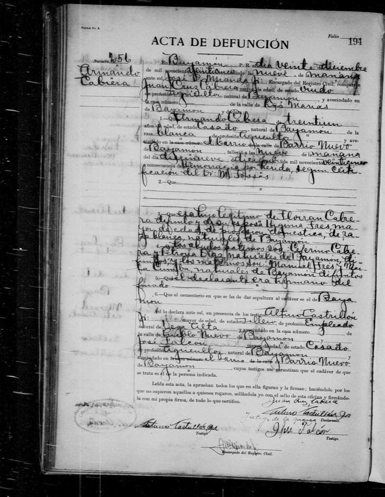 «Cabrera tiró de una cuchilla y pretendió herir por dos veces consecutivas a Federico Torres, quien presenta unas rasguñas en el estómago, y entonces dicho Federico, según los testigos oculares, le tiró un machetazo hiriendo a Cabrera, y además le arrancó la cabeza al herido.»