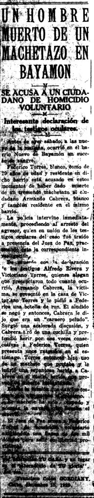Según el artículo publicado en el periódico el Mundo, los hechos ocurrieron la noche de un sábado cuando Armando Cabrera, la víctima, se presentó en la casa de Victoriano Torres (uno de los testigos que hablaron con la policía) y le pidió a Federico Torres, edad 29, piel blanca, y residente de Barrio Nuevo, Bayamón, una botella de ron. Federico, le dijo que no le iba a dar ron y Cabrera se molestó diciéndole que era un «carnero, peleón» entonces comenzaron a discutir, lo que llevó eventualmente al machetazo.