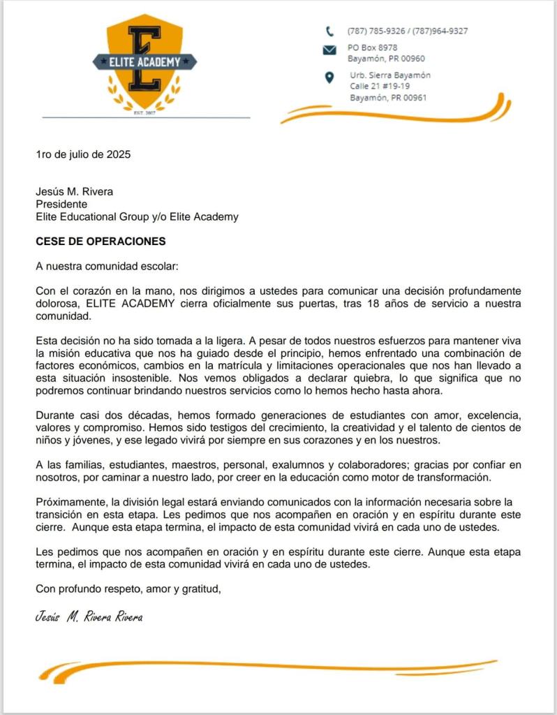 Keishla Ortiz no tenía sospechas de que algo andaba mal con la escuela de sus hijos cuando pagó el 10 de marzo de 2025 la matrícula para el semestre agosto 2025 por la cantidad de $2,950. Sus tres hijos culminaron sin complicaciones el semestre enero- mayo de 2025 en Elite Academy, un colegio privado localizado en Sierra Bayamón. Los hijos de la Sra. Ortiz estudiaban en Elite desde que la institución se llamaba NEMA. Uno estaba en el programa deportivo y otro estaba por graduarse de 8.º grado. Fueron a las reuniones de la clase y estaban planificando su primera actividad. Pero todo cambió el 1 de julio, cuando la escuela avisó a través de una carta por correo electrónico que cerraba operaciones de manera inmediata.