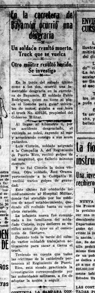 Un accidente de carácter fatal ocurrió el 5 de diciembre de 1925 en una carretera no especificada de Bayamón.