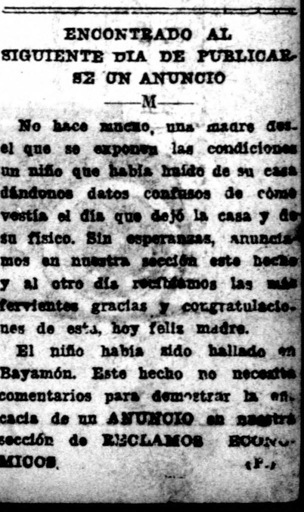 No hace mucho, una madre desesperada por el que se exponen las condiciones de un niño que había huído de su casa dándonos datos confusos de cómo vestía el día que dejó la casa y de su físico. Sin esperanzas, anunciamos en nuestra sección este hecho y al otro día recibimos las más fervientes gracias y congratulaciones de esta, hoy feliz madre. El niño había sido hallado en Bayamón. Este hecho no necesita comentarios para demostrar la eficacia de un ANUNCIO en nuestra sección de RECLAMOS.”