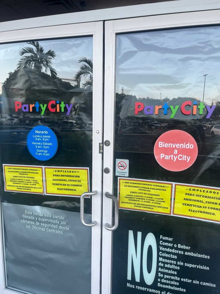 En la entrada de la tienda en Bayamón hay letreros que dicen “HOY PERMANECEREMOS CERRADOS ** LE INVITAMOS A PASAR POR NUESTRA TIENDA DE: PARTY CITY DE GUAYNABO” y “EMPLEADOS PARA INFORMACIÓN ADICIONAL, FAVOR DE VERIFICAR SU CORREO ELECTRÓNICO.”
