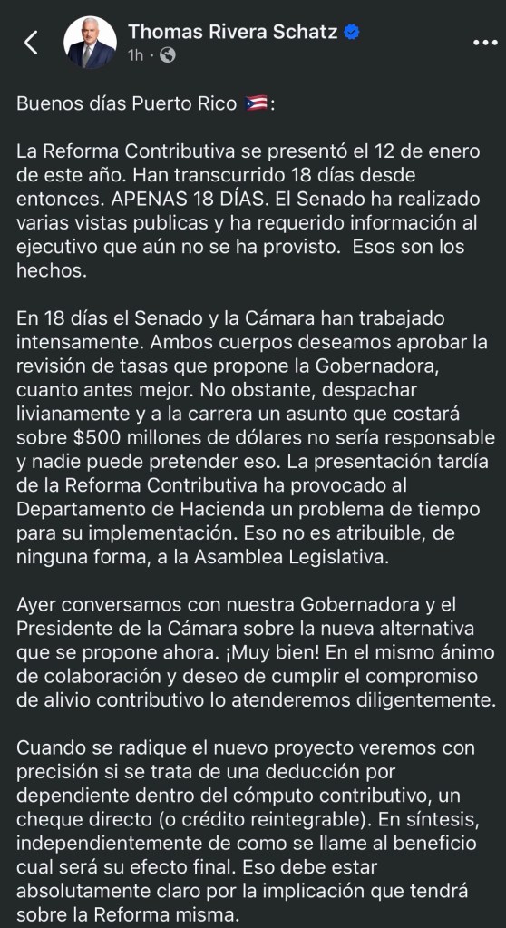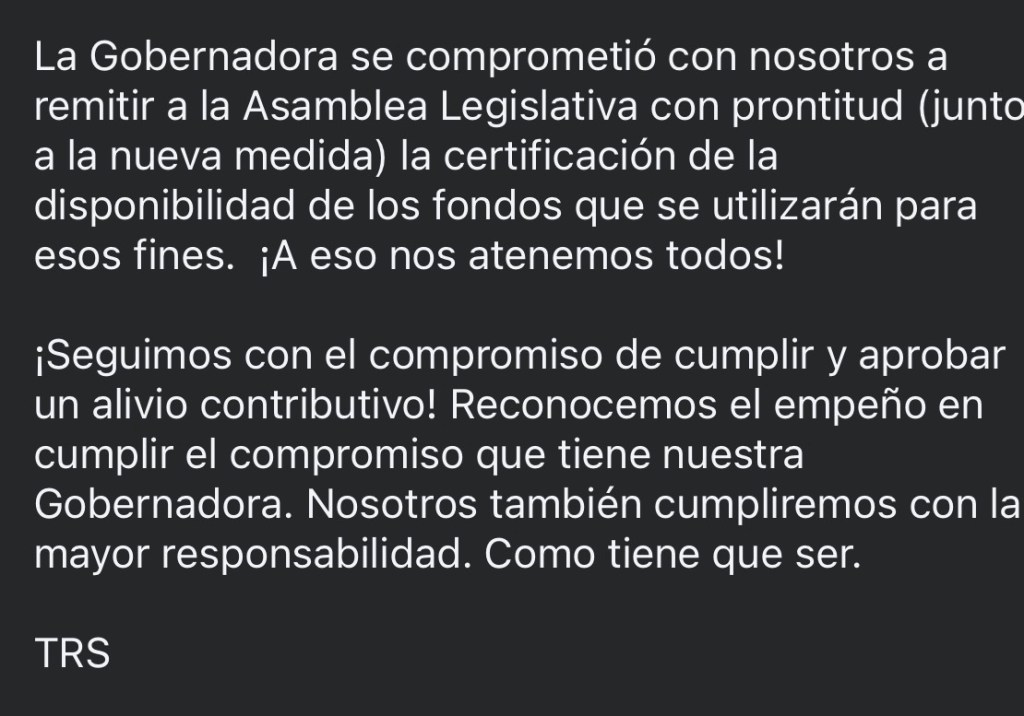 El anuncio se realizó junto al secretario del Departamento de Hacienda, Ángel Pantoja. Según se indicó, la iniciativa fue discutida previamente con los presidentes de los cuerpos legislativos. La medida se presentará junto a la certificación de los ahorros y busca facultar al Departamento de Hacienda para la confección y emisión de los cheques mientras la Asamblea Legislativa evalúa la Reforma Contributiva.