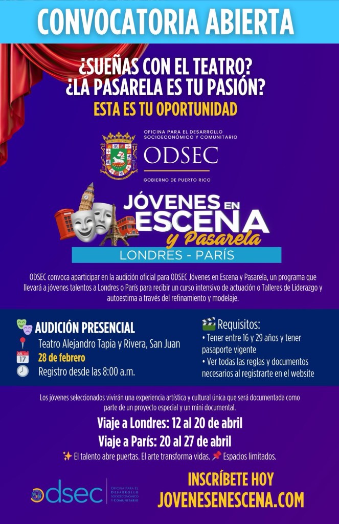Para inscribirse y conocer los requisitos del proceso de selección, los interesados pueden acceder a http://www.jovenesenescena.com, comunicarse al 787-977-7060 o escribir a info@odsec.pr.gov para más información.