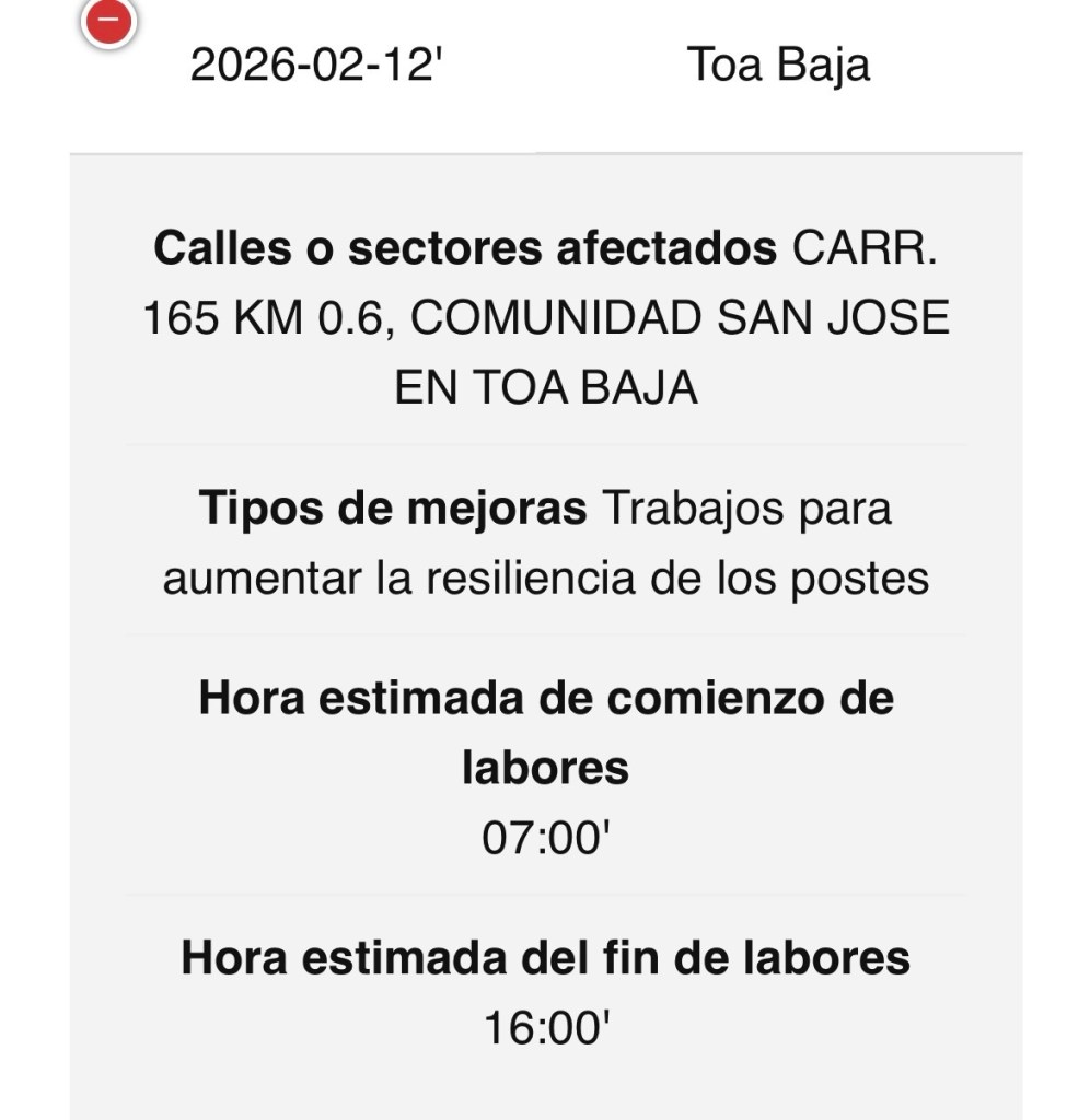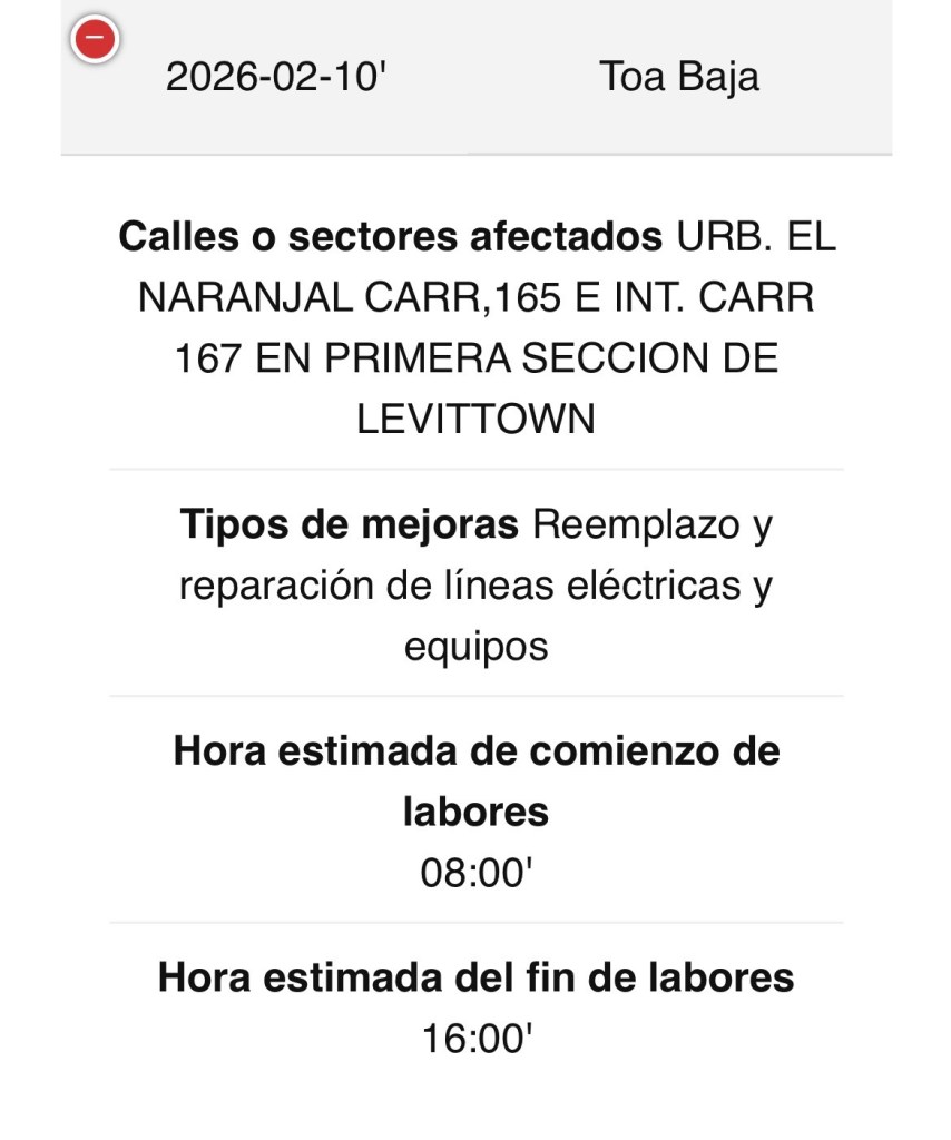 El 10 de febrero, en Toa Baja, se verá afectado partes de Levittown, Sabana Seca, Mansiones del Mar y el sector Los Bravos. LUMA realizará trabajos en los postes. Ese mismo día. En Candelaria y en la Farmacia Marlene se realizará una “nueva construcción.” También trabajaran en la Urbanización El Naranjal remplazando y reparando lineas eléctricas. Los trabajos en Levittown son entre 6:00am a 6:30pm y los de Candelaria entre 8:30am a 6:00pm