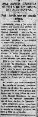 «Una de las balas fue a herir a la prima de Hernández, Perfecta Hernández, agraciada joven, como de 18 años de edad, que participaba de la alegría, y quien se desplomó al suelo bañada en sangre, atravesada la frente por la bala mortal. La muerte fue casi instantánea.» Dice el artículo publicado el 2 de enero de 1926.