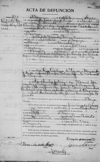 «Que Perfecta Hernández Torres, de diecinueve años de edad, de estado soltera, natural de Bayamón, de la raza blanca, de profesión doméstica y avecindado en la casa número __ de la calle de Dr. Veve de Bayamón, falleció a las una de la mañana del día primero de enero de mil novecientos veintiséis, a consecuencia de fractura del cráneo por herida por arma, según certificación del Dr. Agustín González.»
