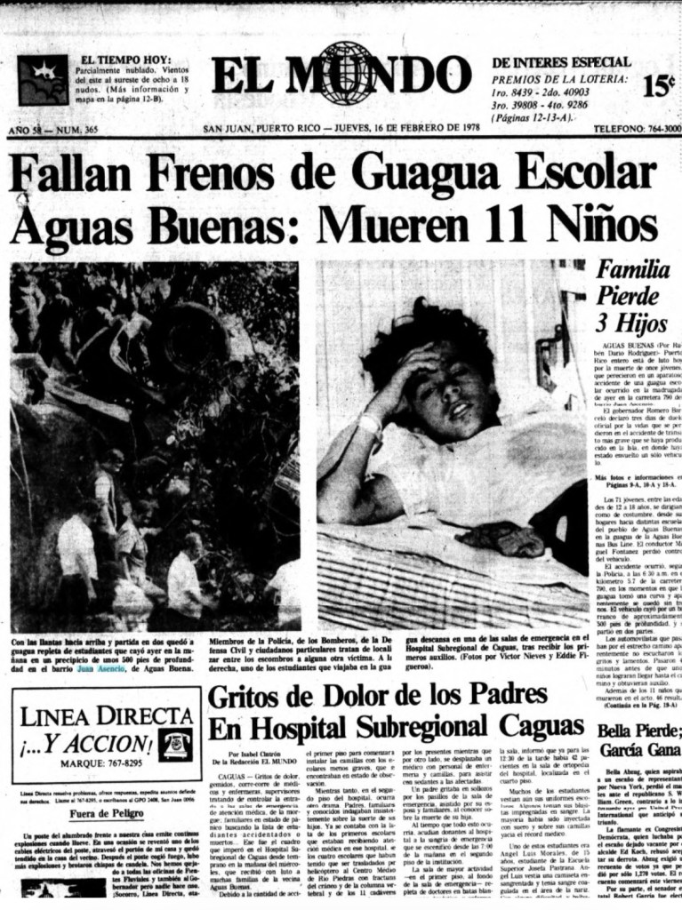 La mañana del 15 de febrero de 1978, una guagua escolar que transportaba estudiantes por la carretera PR-790, en el barrio Juan Asencio, sufrió una falla mecánica que provocó que el vehículo se precipitara por un barranco. En la guagua viajaban 65 menores,