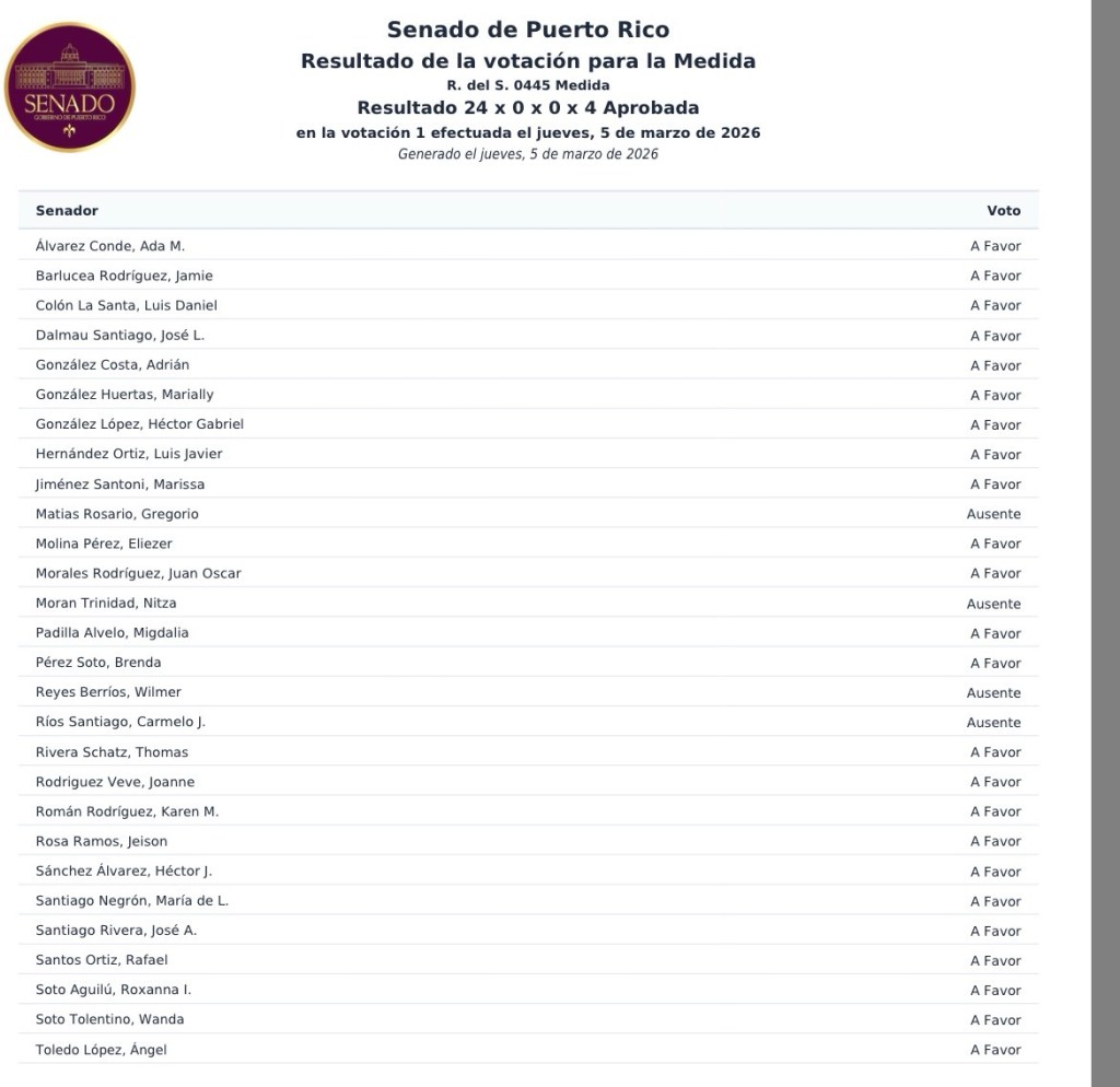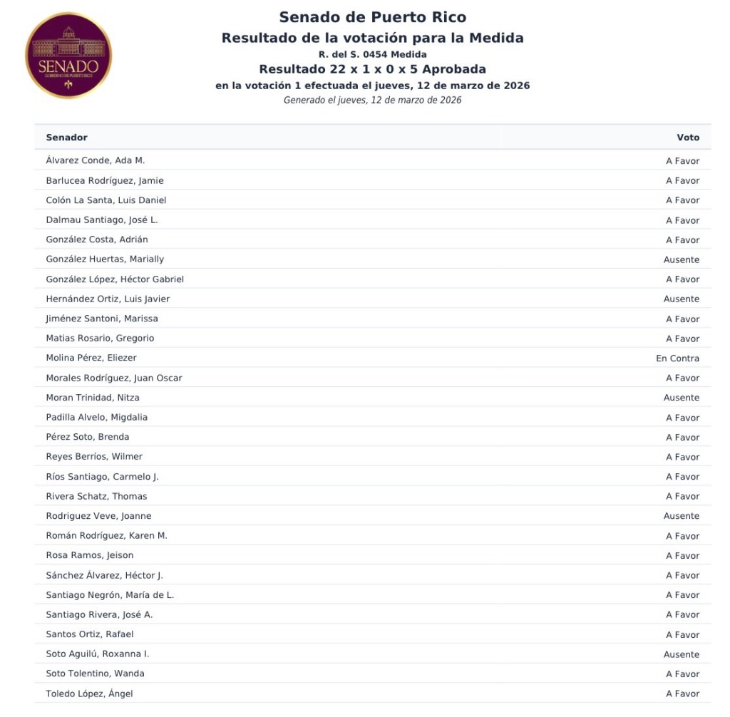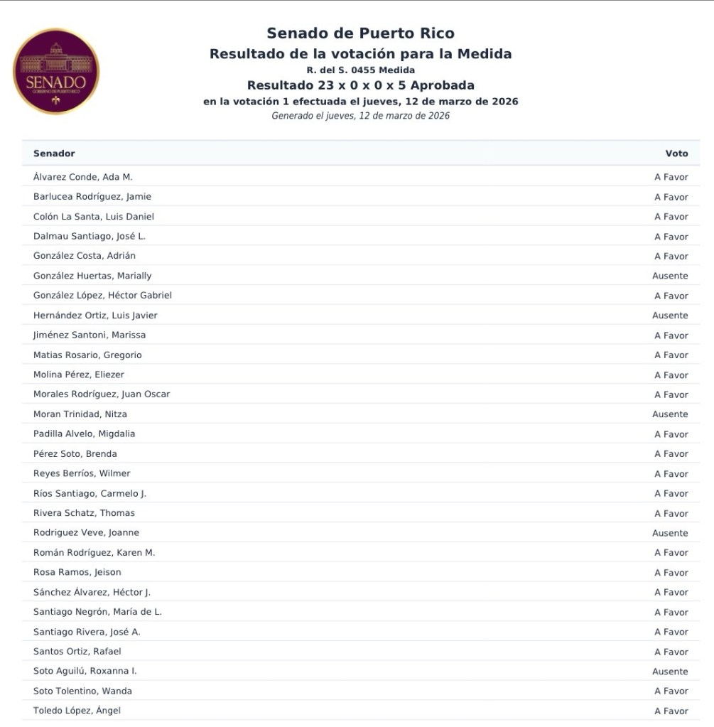 La resolución fue aprobada en el Senado de Puerto Rico el 12 de marzo de 2026 por votación Unánime.