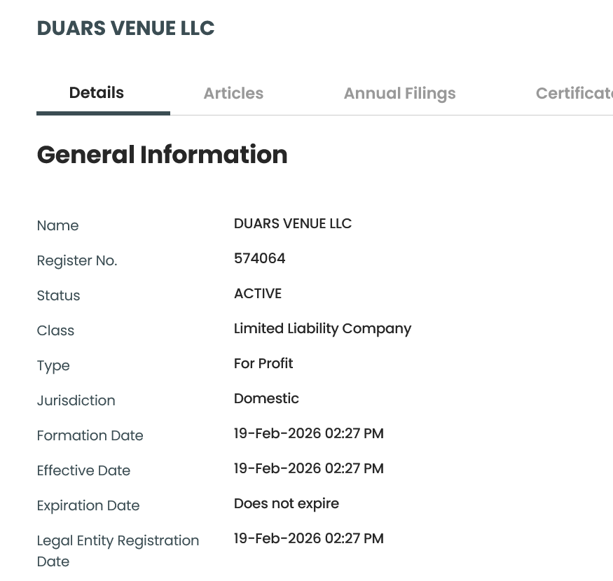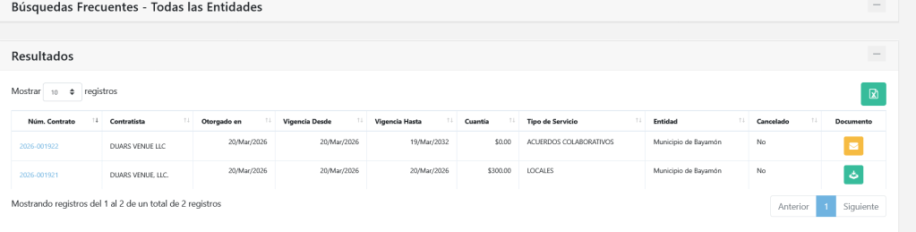 Duars Venue LLC fue incorporada el 19 de febrero de 2026 por Eric Pérez y según el registro de contratos de la Oficina del Contralor, el contrato fue firmado el 20 de marzo de 2026. Duars se encargará de la administración, operación y el mantenimiento de la instalación y el municipio por su parte, recibirá el 8% de los ingresos netos que reciba el operador durante la vigencia de seis años que dura el contrato.
