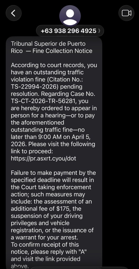 Según se ha identificado, los impostores hacen alusión a un número de caso judicial falso, exhortando a la persona que recibe el mensaje a pagar una supuesta multa pendiente a través de un enlace fraudulento provisto en el mismo mensaje de texto. También incluyen una fecha límite para ejercer dicho pago y amenazan con la imposición de cargos, suspensión de la licencia de conducir y hasta la posibilidad de que se emita una orden de arresto en su contra.
